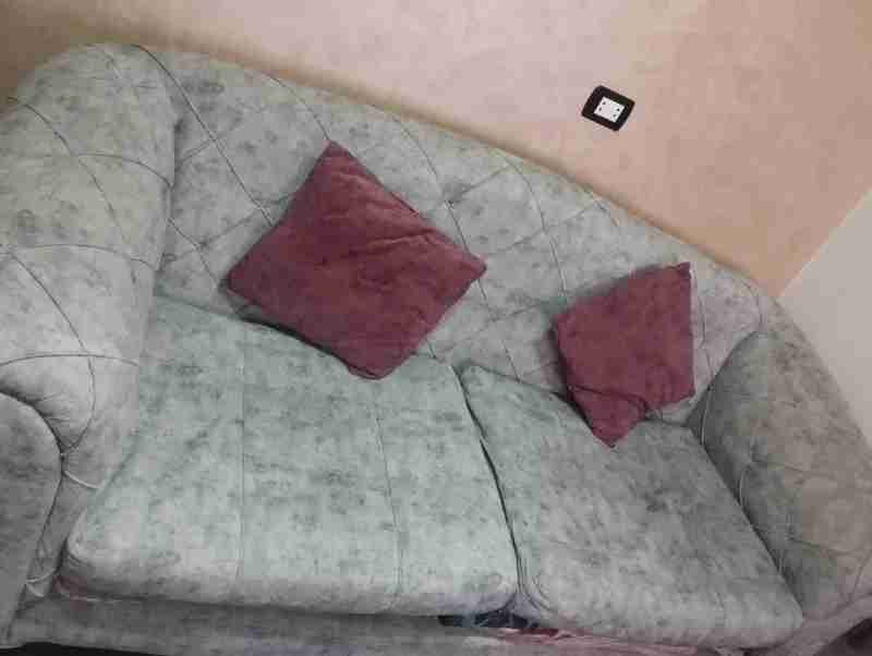 طقم انتريه اتنين كنبه واحده كبيره وواحده صغيره واتنين كرسي كبار لون رمادي ونبيتي او كاشمير غامق استعمال عروسه حالتهم جديده ومعاه الكسوه نبيتي