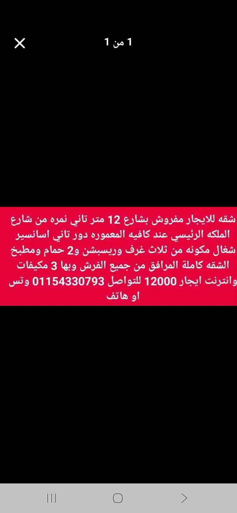 شقه للايجار مفروش بالدور الثاني بعد الأرضي مكونه من ٣ غرف وريسبشن و٢ حمام ومطبخ الشقه متشطبه تشطيب سوبر لوكس الشقه كاملة المرافق وبها ٣ مكيفات وواي فاي بشارع ١٢ متر تاني نمره من شارع الملكه الريءيسي عند كافيه المعموره