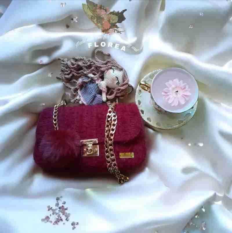 الشنطه متوسطه الحجم مصنوعه من شبك الكانفا وخيط الفرو البرجاندى