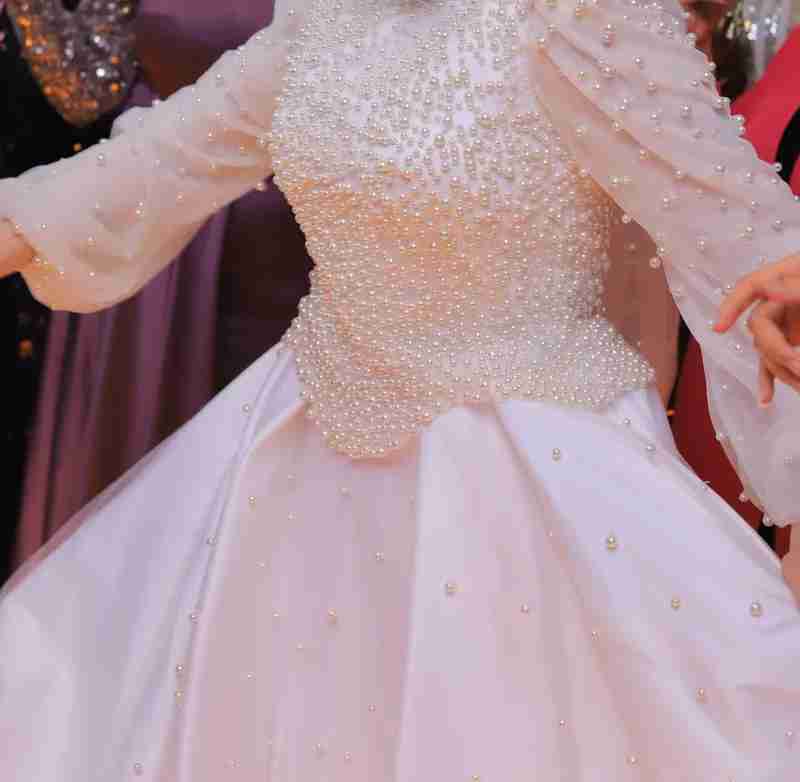 فستان فرحي اتلبس يومها بس هاند ميد منفصل معه طرحته فستان شيك جدًا، متطرّز بلؤلؤ ناعم على الصدر بشكل يدي فخامة من غير مبالغة. الأكمام تول شفافة وعليها لؤلؤ خفيف، والتنورة واسعة ومنسدلة بتدي شكل أنثوي وهادي.
