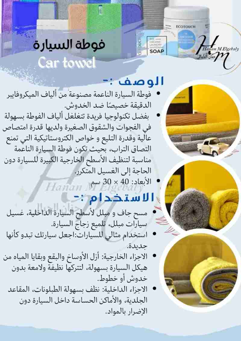 فوطة العربية من إيكواي مصممة مخصوص لتنظيف وتجفيف السيارات بكفاءة عالية ومن غير أي خدوش. مصنوعة من ألياف مايكروفايبر ناعمة وقوية، بتمتص المياه والأتربة بسرعة وبتسيب السطح لامع ونضيف.