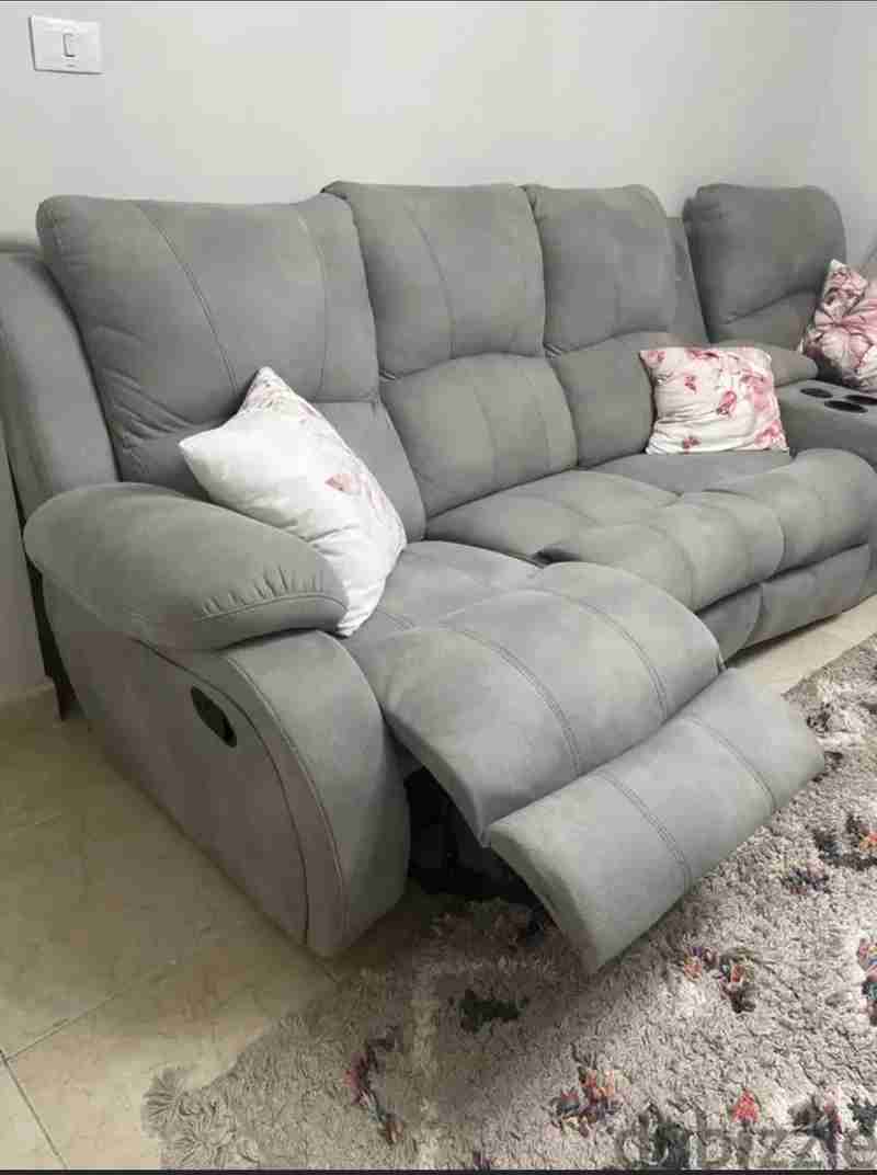كنبة خشب زان دمياطي قماش قابل للغسل و مانع للسوائل يوجد بها ميكانزم ودرج و سماعات و مكان للمشروبات و يو اس بي للشحن و معها الشاحن و الخوداديات سعرها جديد ٦٠ الف