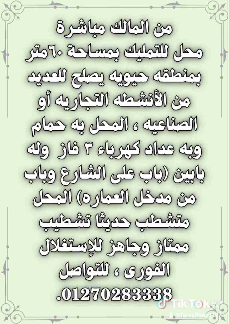 من المالك مباشرة : محل بمساحة ٦٠متر بمنطقه حيويه يصلح للعديد من الأنشطه التجاريه أو الصناعيه ، المحل به حمام وبه عداد كهرباء ٣ فاز وله بابين (باب على الشارع وباب من مدخل العماره) المحل متشطب حديثا تشطيب ممتاز وجاهز للإستغلال الفورى ، للتواصل***8.