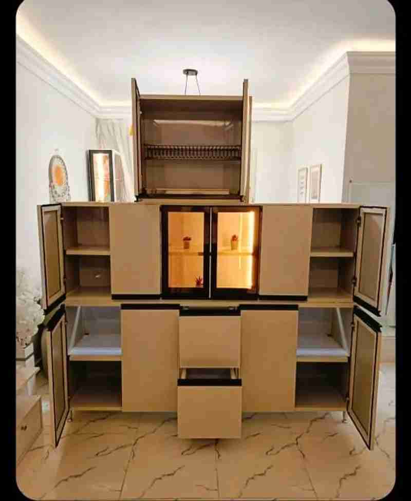 مطبخ مضئ الوميتال مقابض بلت ان لون اوف وايت فانيليا وحده ٢ متر فوق و٢ متر تحت ومطبقيه منفصله داخلها صفايه ٧٠ سم