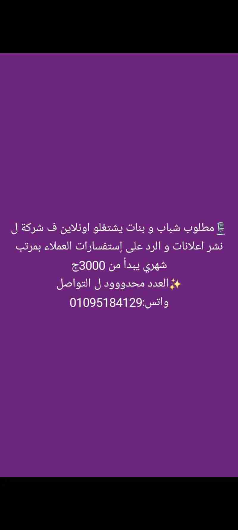 وظيفة دعايا واعلان ورد علي استفسارات العملاء بمرتبات شهريه تبدا من 2000وتصل 10000(مطلوب شباب وبنات) كلموني اساعدكم لحد م تستلم الشغل لعلي وعسي ان يكون فتحه خير عليكم