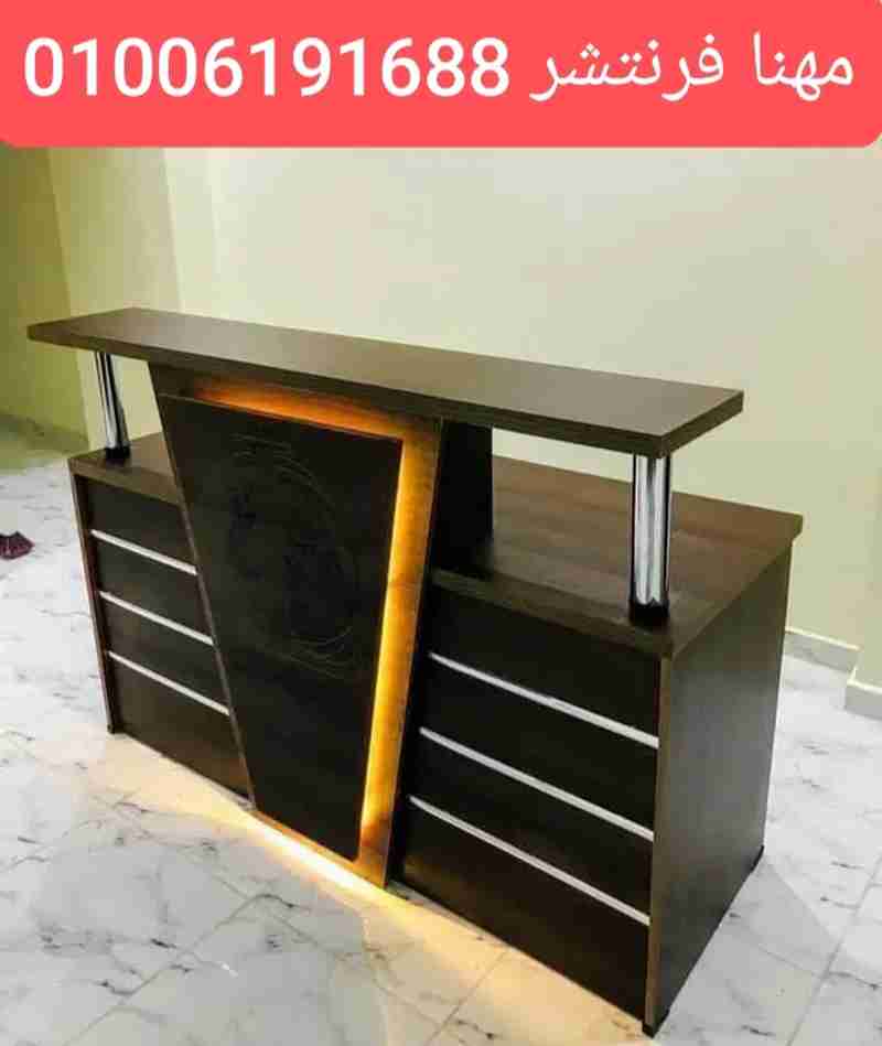 كاونتر استقبال مكاتب خامات خشب ارو دهانات بنى متكامل بالشانون وترابيزة شاى كنب إنتظار كراسى من مهنا اوفيس 01006191688