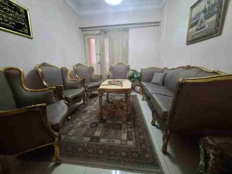 صالون كلاسيك للبيع بحالة جيدة جدا كنبة كبيرة و٤ فوتيه وترابيزة وسط برخام بالستارة بتاعته