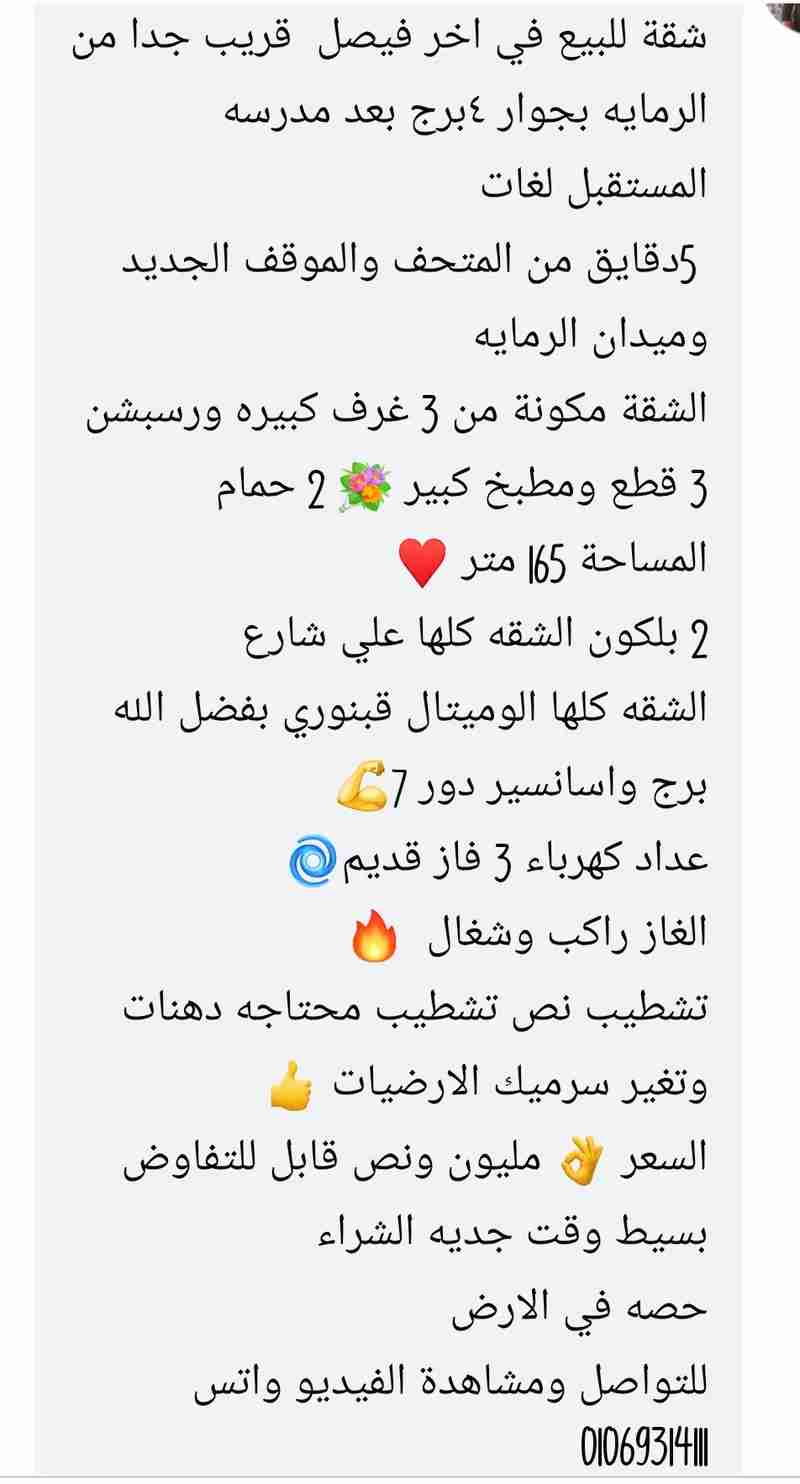شقة للبيع في اخر فيصل قريب جدا من الرمايه بجوار ٤برج بعد مدرسه المستقبل لغات 5دقايق من المتحف والموقف الجديد وميدان الرمايه الشقة مكونة من 3 غرف كبيره ورسبشن 3 قطع ومطبخ كبير 💐 2 حمام المساحة 165 متر ♥️ 2 بلكون الشقه كلها علي شارع الشقه كلها الوميتال قبنوري بفضل الله برج واسانسير دور 7💪 عداد كهرباء 3 فاز قديم🌀 الغاز راكب وشغال 🔥 تشطيب نص تشطيب محتاجه دهنات وتغير سرميك الارضيات 👍 السعر 👌 حصه في الارض للتواصل ومشاهدة الفيديو واتس